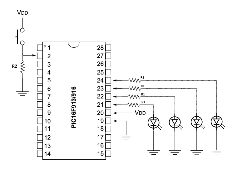 1 2 3 4 5 6 7 8 9 10 11 12 13 14 15 16 17 18 | ;Chip Settings #chip 16f916,8 #config OSC=INTRC_OSC_NOCLKOUT Dir PORTA.0 In Dir PORTB Out counter1 = 0 Do Forever Do Until PORTA.0 = 1 Loop Do Until PORTA.0 = 0 Loop counter1 = counter1 + 1 If counter1 > 8 Then counter1 = 0 end if PORTB = counter1 Loop |
