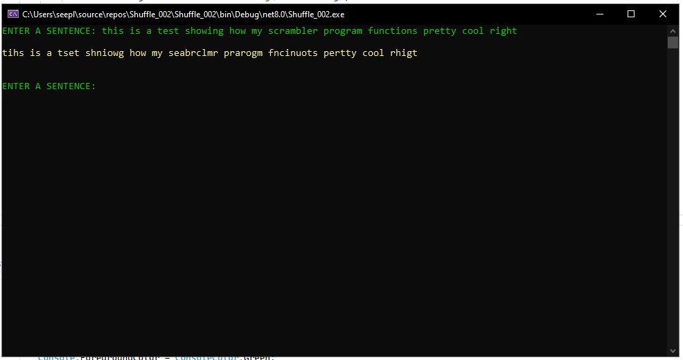 This program inputs a sentence and then shuffles the inner letters of every word. This was inspired by the internet meme where you can read a sentence even though the inner letters of every word are shuffled. As long as the first and last letters in each word are the same as the original letters.